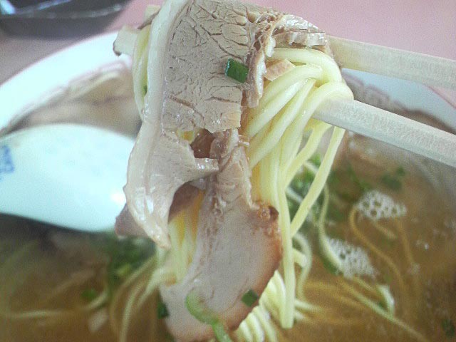 透明感があるスープでひじょうにあっさり。チャーシューはうすぎりでやわらかい感じでした。